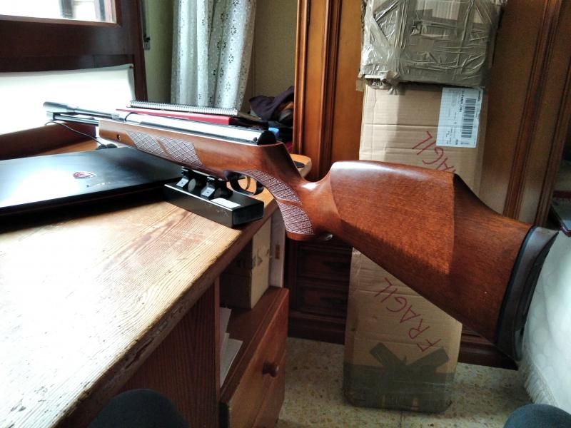 La culata lleva una seta para Field Target artesanal que se pone y se quita fácilmente por medio de un raíl cola de milano de 11mm. Está perfectamente hecho, nada chapucero y es muy discreto si se opta por tirar sin seta.