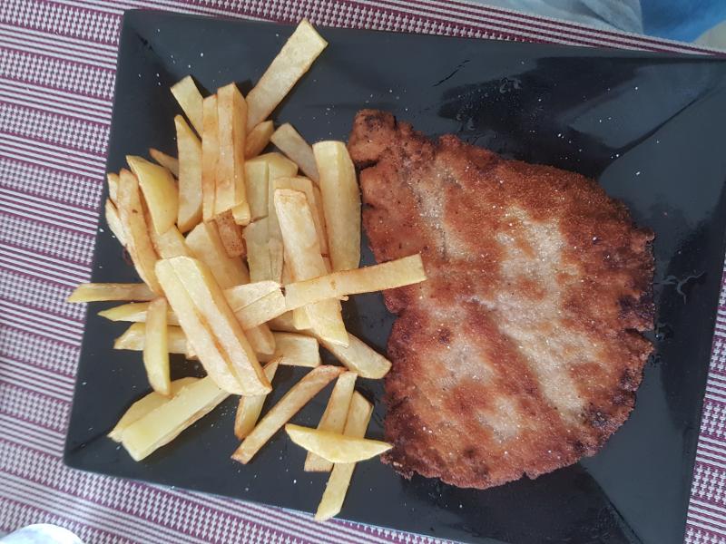 Hoy filetes de ternera empanados con harina huevo y pan rallado, no tiene especies porque han estado mis nietos y no son amigos de ellas. Tampoco los he tenido antes en leche al ser de ternera, estaban tiernos y no ha sido necesario, guarnición patatas fritas de DIA.