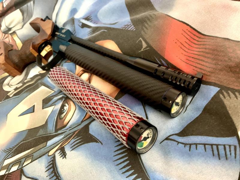 No tiene ni la más mínima marca de uso, ni en el pavón, ni en las bombonas, ni en la empuñadura original de madera. Incluye un cartucho azul y otro rojo, ambos inmaculados como ya he dicho... El azul, así como el cañón, tienen colocados un vinilo 3D efecto carbono, que queda precioso y está muy muy bien instalado (no en plan chapuza). No obstante se puede retirar, sin el más mínimo esfuerzo, pero sería una pena, porque queda chulisimo tal como está.