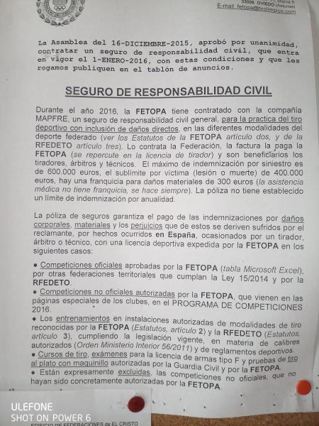 Eso lo deberían de poner en todos los clubes para que todos estemos informados. Si claro que estoi federado. No lo e preguntado en la Federación pero lo voy a preguntar por eso mismo, porque aver si solo va a cubrir las tiradas oficiales.