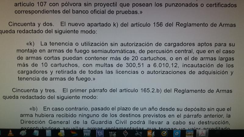 Acabo de leer toda la modificación del reglamento y lo unico referente a cargadores que he visto es lo que dejo en las fotos, salvo que se me haya pasado algo o que en el antigüo reglamento haya algo mas, que lo dudo.