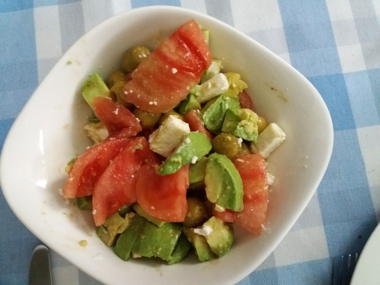 La ensalada es parecida a las anteriores, pero de aguacate, mozarella de leche de búfala, huevo duro y tomate rosa.