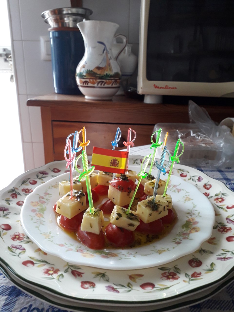 Banderillas de queso de cabra semicurado y tomates cherry con orégano y AOVEX Arróniz( delicioso), el sobrante se utilizó para unas acelgas cocidas.
