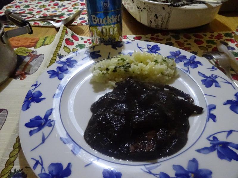 También he puesto ensaladilla de entrante, luego calamares en su tinta con arroz pilaf, de postre chuchus de nata y Buckler 0,0 con limón a la que he añadido el zumo de uno de los limones de mi limonero macetero.