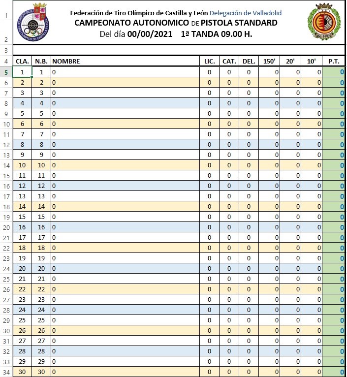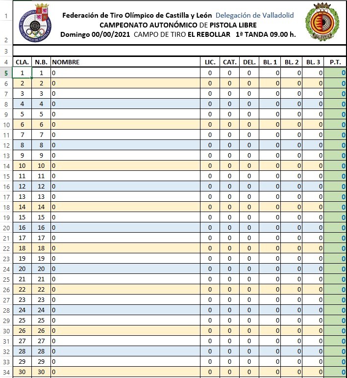 En mi caso ya la tengo "automatizada" para mi Federacion y tecleando el numero de licencia del año, sale automaticamente nombre, categoria y Delegacion del tirador. Pero si no disponeis de esa base de datos, modificaria la hoja para que escribais esos datos en cada competicion y listo.