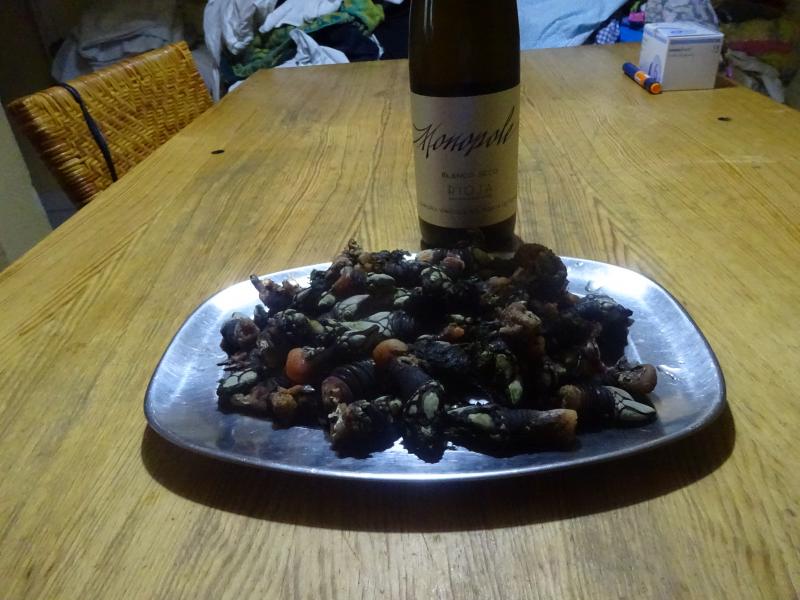 Luna Llena = Bajamar extrema, con buen tiempo = ¡¡¡Percebes!!!, los he mojado con Monopole de CVNE varietal Viura, mucho mejor que el puripublicitado y por muchos apreciado Verdejo, que donde te veo te dejo.