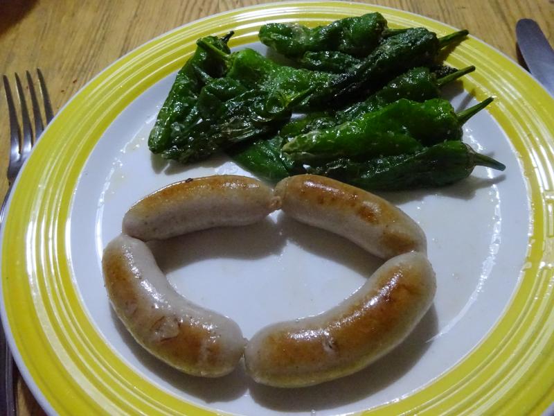 Acaba de iniciarse la temporada del pimiento verde de Guernica, luego afotos de varios platos que lo incorporan, como salchichas blancas tipo Viena y filetes de lomo iberico plancha.