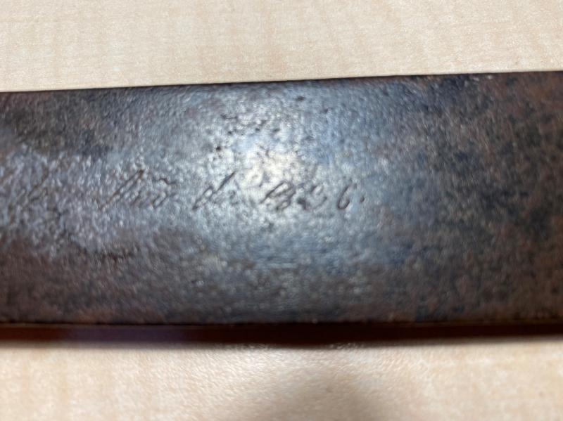Las medidas de la hoja son 60 cm exactos y la empuñadura 13.5 cm, te envío más foto y el año es 1836.