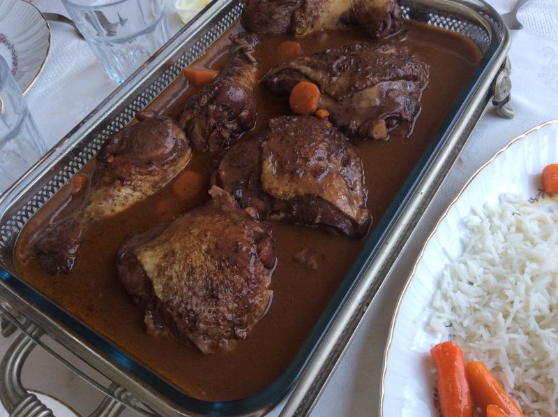 Ayer, un “coq au vin”, o sea, pollo al vino, como todos sabéis. Acompañado de zanahorias glaseadas y arroz basmati (demasiado trabajo para uno sólo cocinar las cebollitas braseadas y los champiñones salteados de rigor).