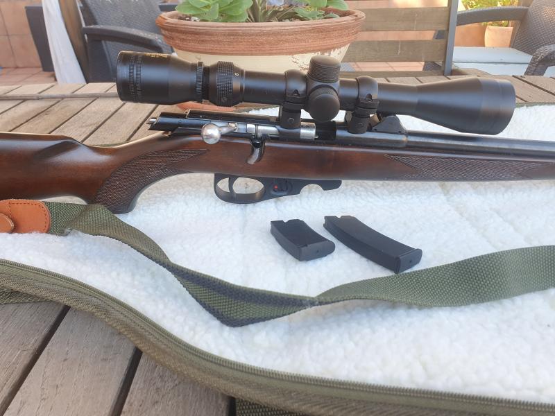 Carabina de cerrojo calibre 22. Marca TOZ (rusa), con funda, correa, 2 cargadores de 5 y 10 cartuchos. Alza de 25 a 100 metros. Visor 3-9x40. Guiada con Licencia F. ¡Está nueva; como mucho 50 disparos! Está en Toledo capital. Precio 180.-€, portes aparte, si hubiera. Javier 634 49 76 51