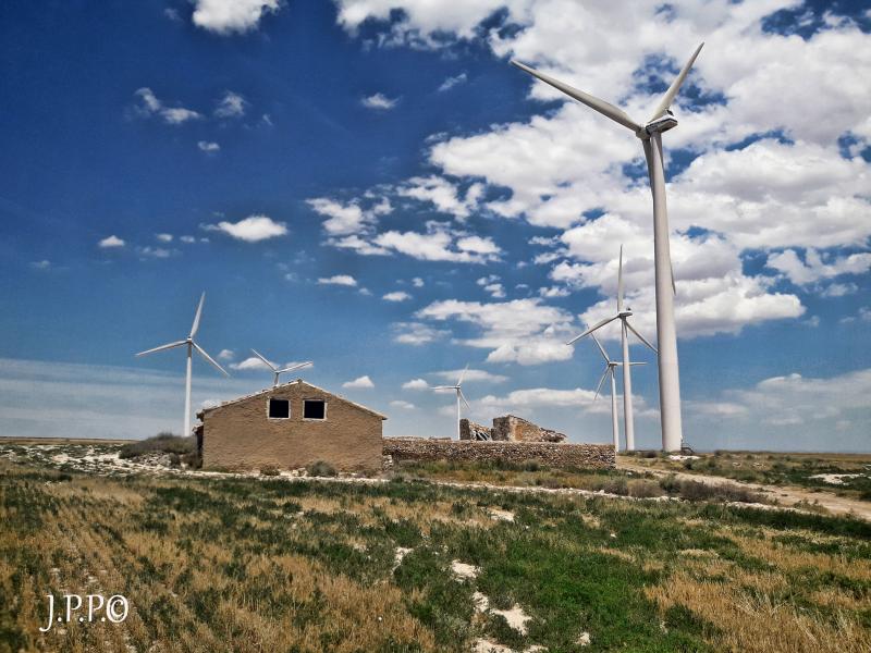 Salgo de Bizkaia, atravieso La Rioja, con sus viñas y sus ya pequeñas uvas, después Navarra, con varias ganaderías de lidia a su paso y sus campos de cereal y finalmente entramos en Aragon, donde el calor ya empieza a ser evidente, sus campos de cereal cosechados hace semanas, asentamientos deruidos de lo que en su día fueron pequeños núcleos poblacionales y los gigantes de tres brazos acompañándome por esos páramos semideserticos.