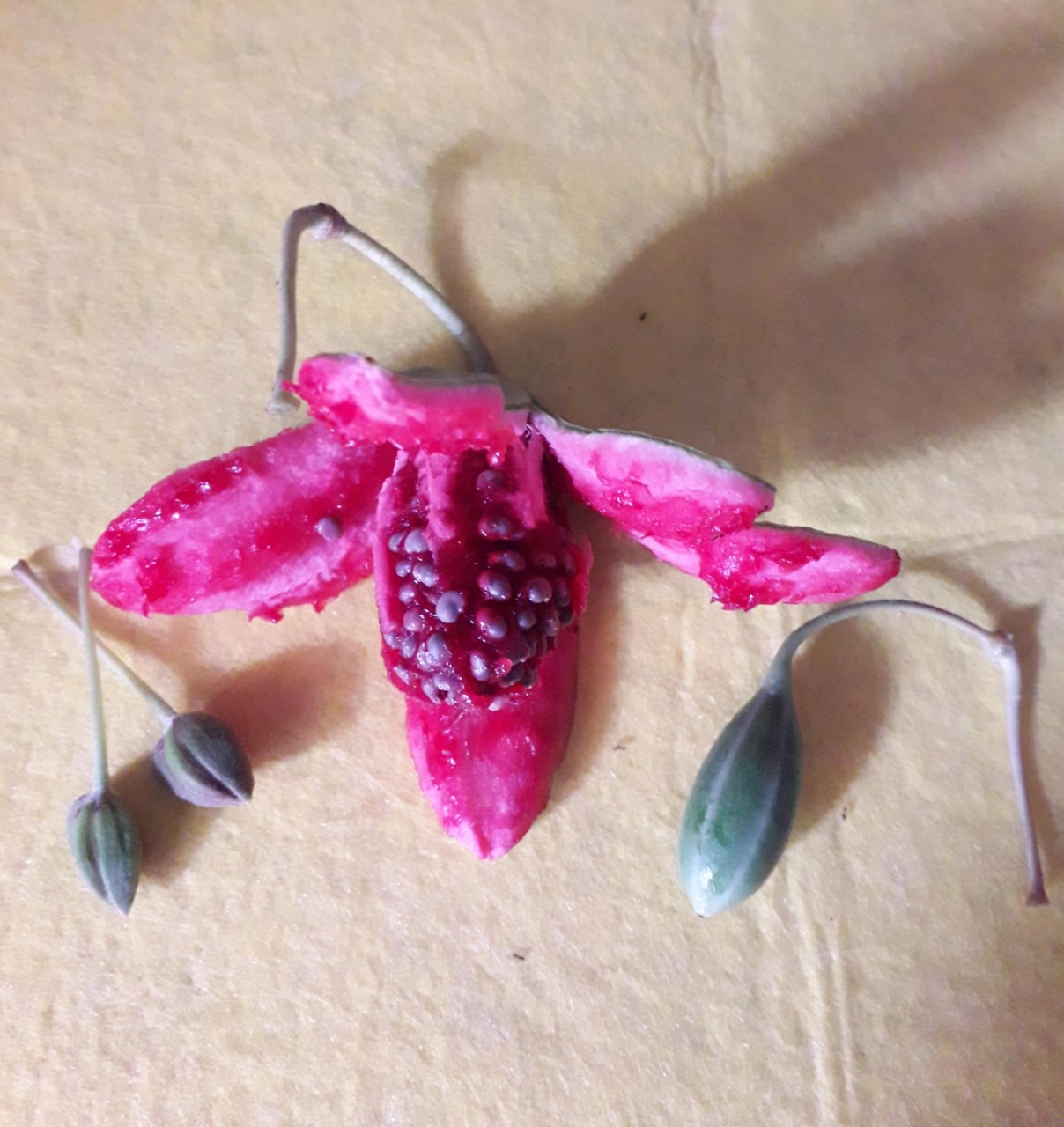 A la derecha la flor antes de abrir ( alcaparra), a la siniestra el fruto ( alcaparrón) y en el centro el fruto maduro mostrando las semillas.