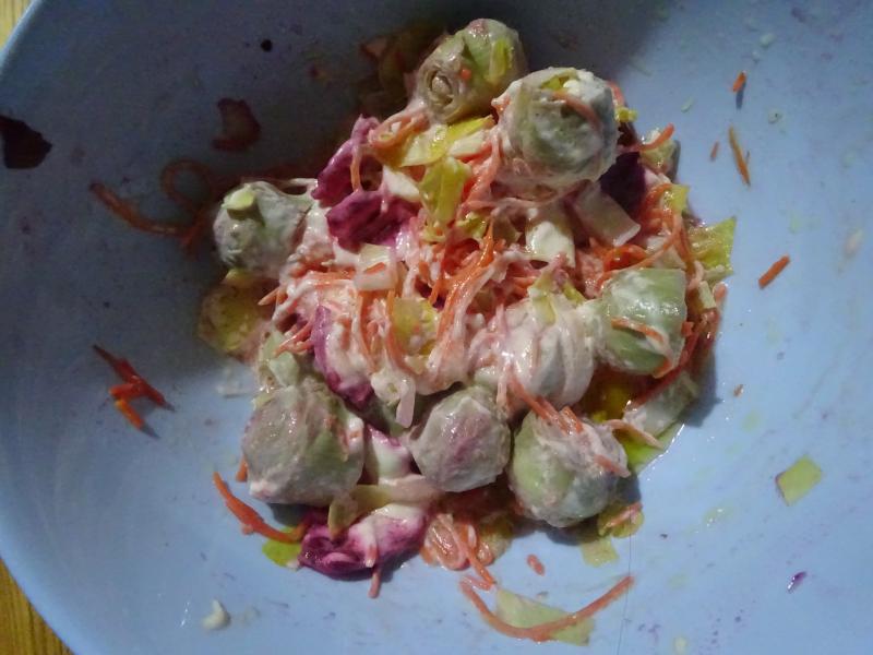 Ensalada de verduras varias con mayonesa, sandwich imperial de jamón York y sabanitas de queso en tostadas de pan integral.