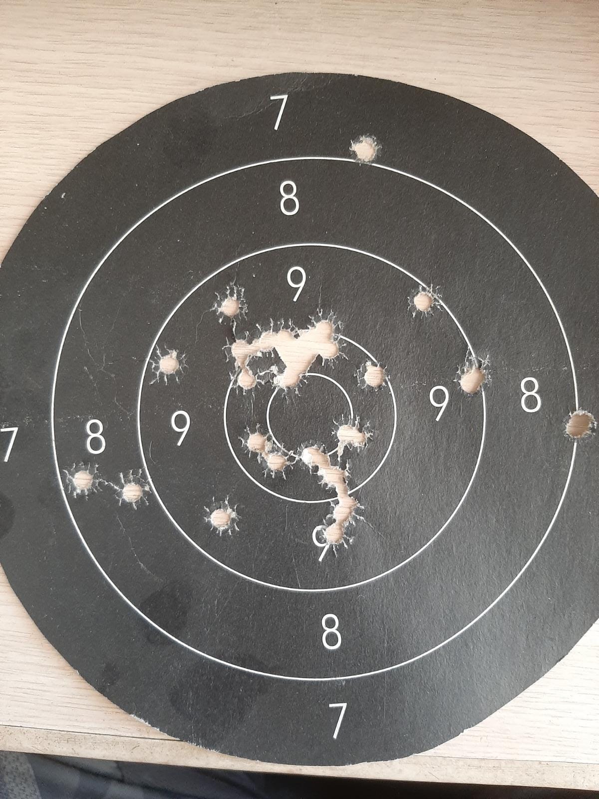 Esta otra diana es con mi destroyer del 9 parabellum disparando en las mismas condiciones con municion recargada con 5 greins de Ba 9 y punta troncoconica de plomo de 124 greins.
