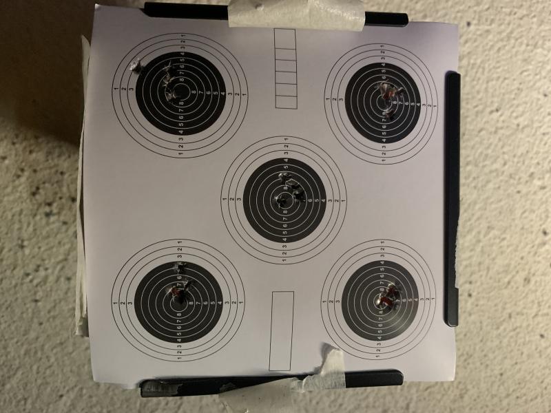 Bien es verdad que de momento sólo he podido tirar a 7m. Los Edgun 4.52 10,34 gr van impresionantes, los JSB Exact Express Diabolo 4.5 de 7,87 gr muy parecidos, bisturís. Aunque curiosamente con la Edgun regulada por debajo de los 7.5J los Edgun con 2,5 grains mas dan energías medias de 6.9J y los JSB de 6.2J y me ha llamado la atención. Los Gamo TS-10 hay que subir un poco la fuerza del rifle y empiezan a agrupar mejor. Creo que a 10m se pueda hacer algo con ellos. Tirando a última hora con un led iluminando y con algo de prisa no han salido malas agrupaciones en 20 tiros (conparadas con las de la foto anterior):