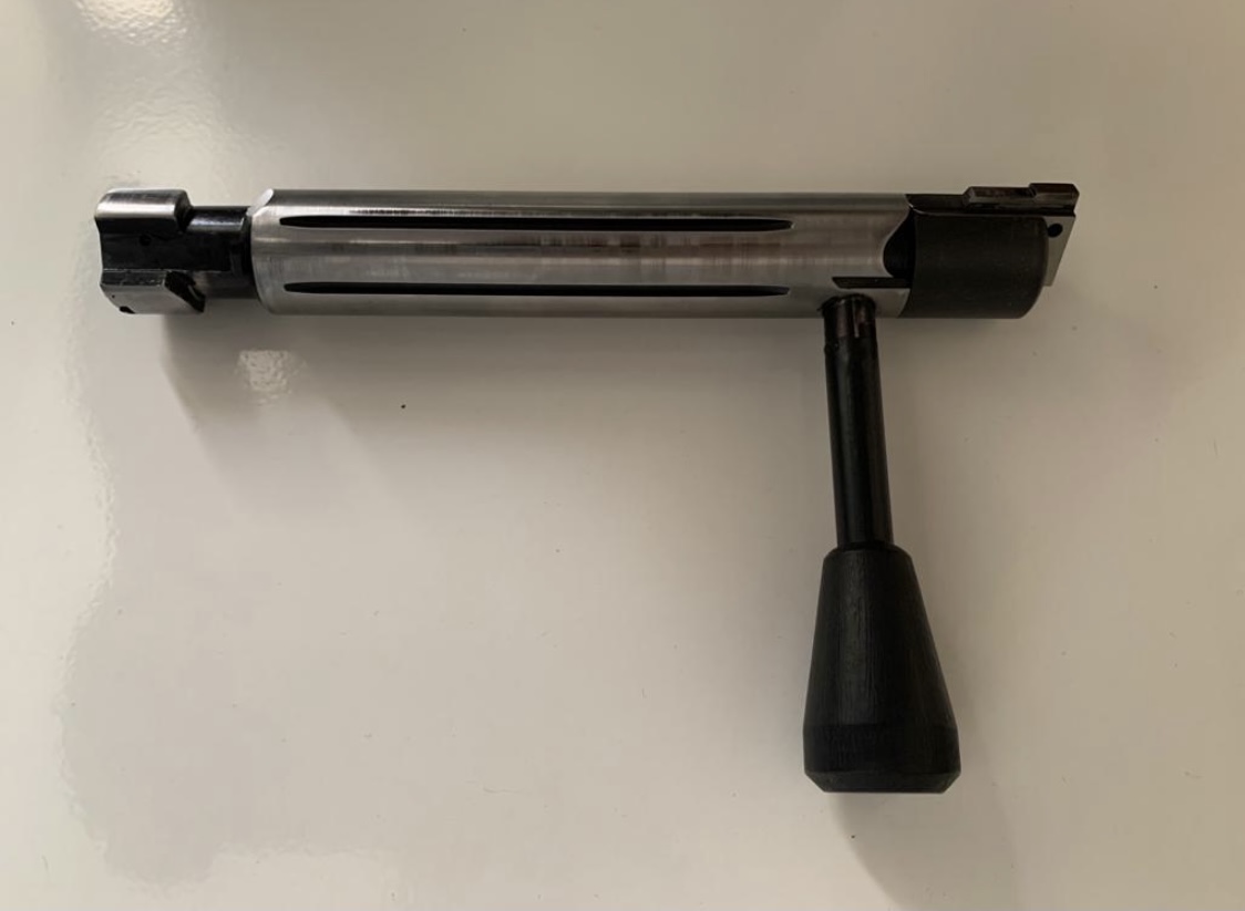Detalle del mastodóntico cerrojo del rifle, con 3 tetones, 18 cm de largo y 3,9 cm de grosor: