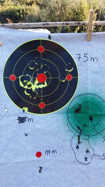 A 75 metros ya los aumentos y el tembleque se notaban mas y apenas tuve que corregir unos 5 centímetros en altura para meterlas en la zona central de la diana, hay 4 disparos.