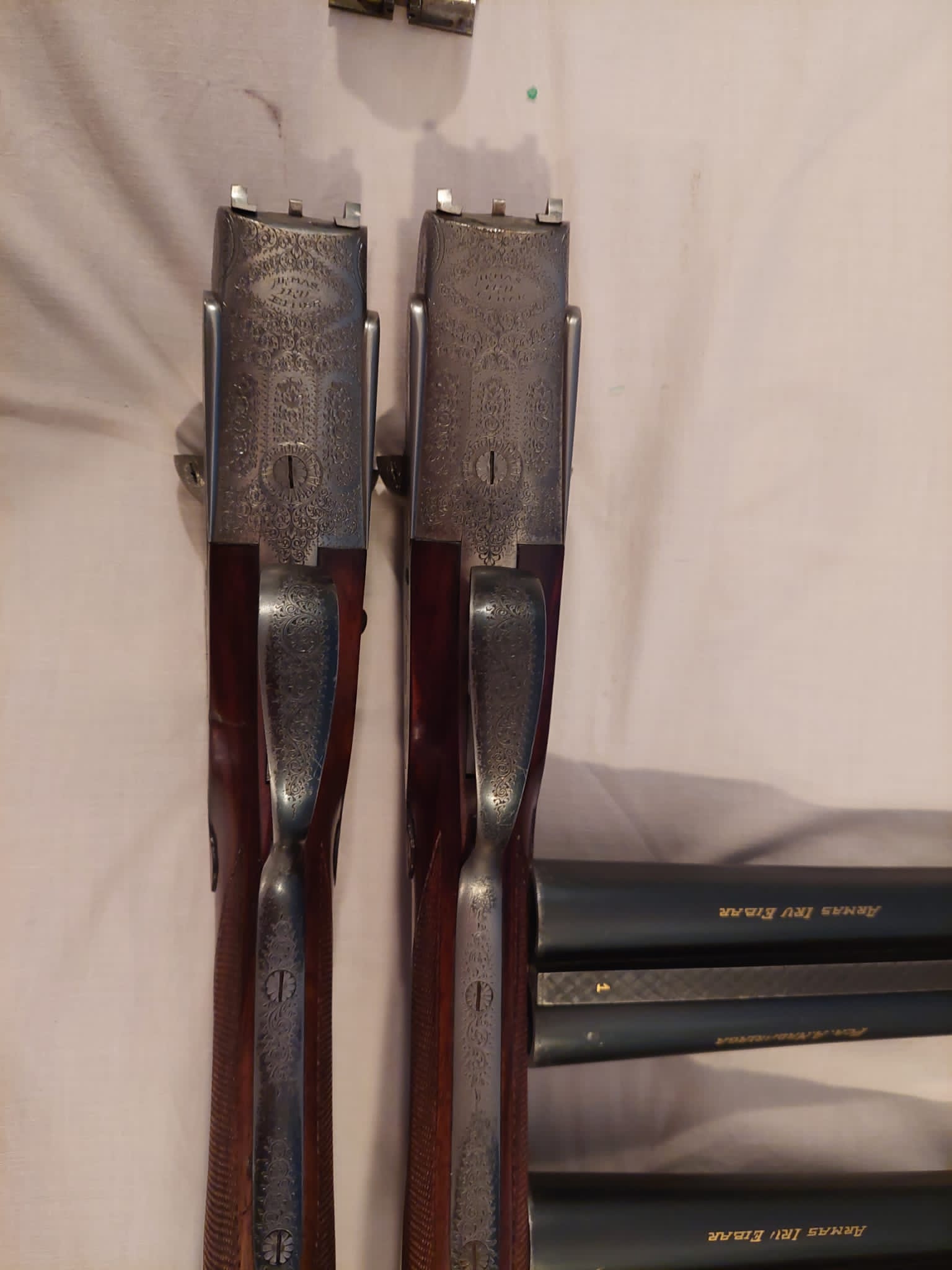 Vendo pareja de escopetas paralelas marca "IRU" de Antonio Madariaga, cañones de 70ctm. con 3 y 1 estrellas, expulsoras, gatillo articulado, triple cierre Purdey, seguro automático, válvula de escape de gases, pletinas desmontables con palomilla, finos grabados, inserciones en oro, números correlativos, culatas de nogal, fundas de cuero forradas de borreguillo.