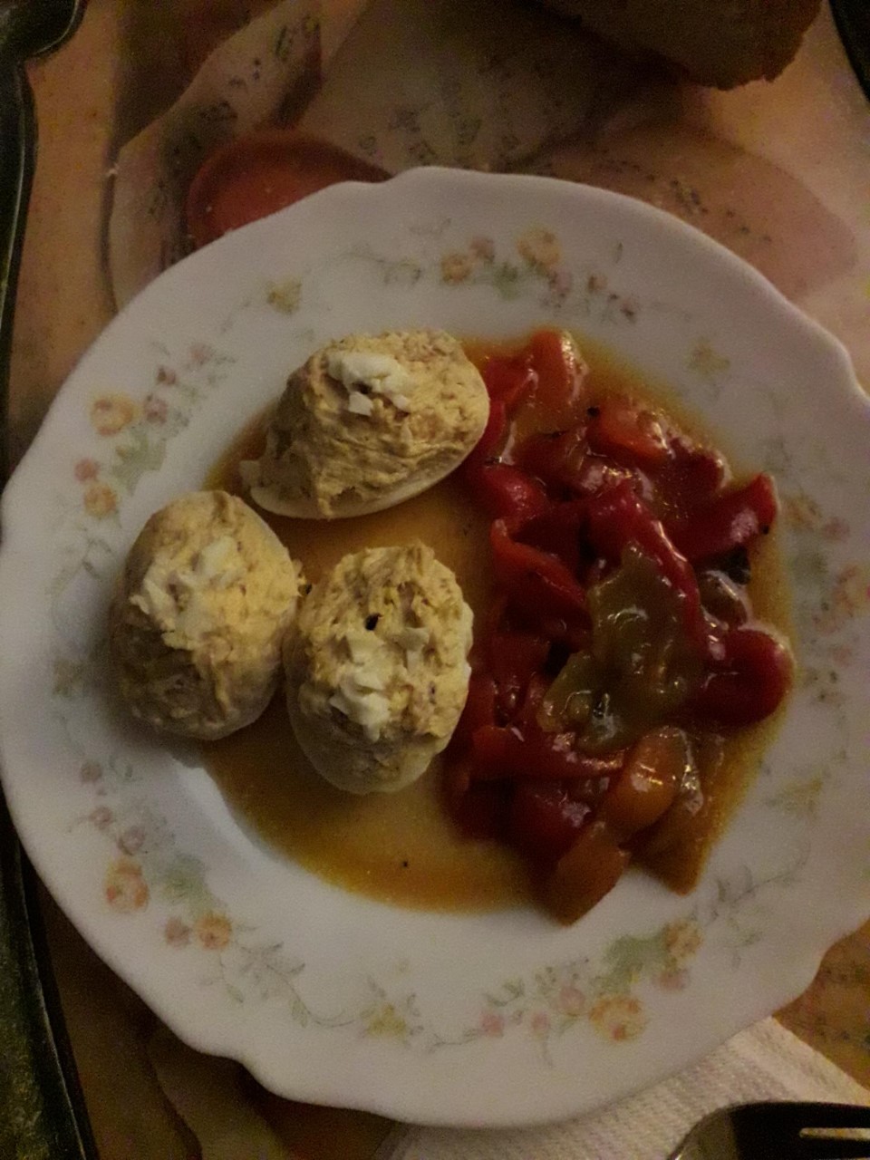 Huevos rellenos con pimientos asados.
