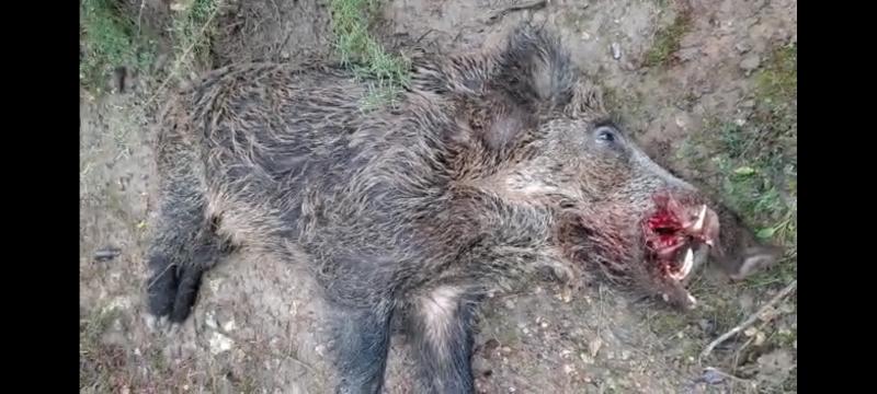 El calibre utilizado 300 WM, en Browning Lon Track, de 51 cm de cañon. Proyectil HPF en 157 gn. Tiro de montería de arriba a abajo algo trasero, como se ve, pero el cochino solo pataleo unos segundos, no he podido recuperar proyectil al desintegrarse dentro del cuerpo de esa mole.