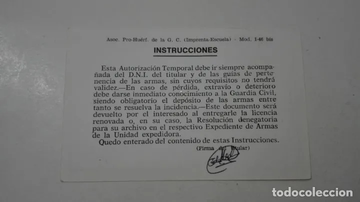 La tarjeta de autorización temporal para uso de armas que me dieron, es la misma tarjeta de cartulina que dan en guardia civil cuando solicitas la renovación de las licencias, que es el formato que se debe estar usando desde hace 40 o 50 años. Adjunto unas imágenes del formato de tarjeta que me entregaron. Es del tamaño del DNI antiguo, un poco más grande que una tarjeta de crédito.