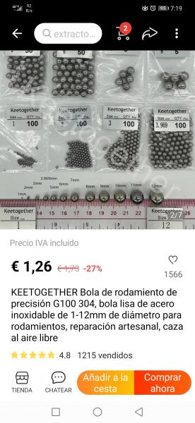 kijoseki escribió:Para las bolitas, igual tienes suerte y te valen las que traen los balines rocket de Gamo, que son de acero y las tienes en dos medidas: no recuerdo bien pero ms suena 2'8mm diámetro en los balines de 4'5 y 3,2 en los de 5'5mm...igual alguien tiene y los puede comprobar.
