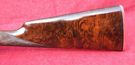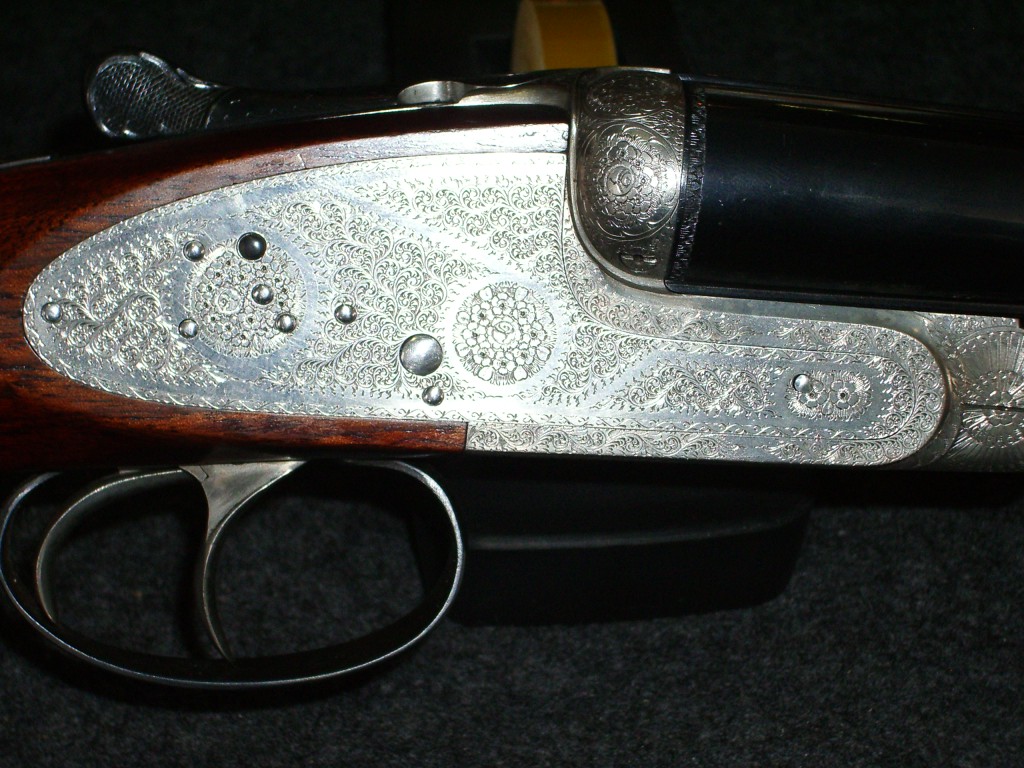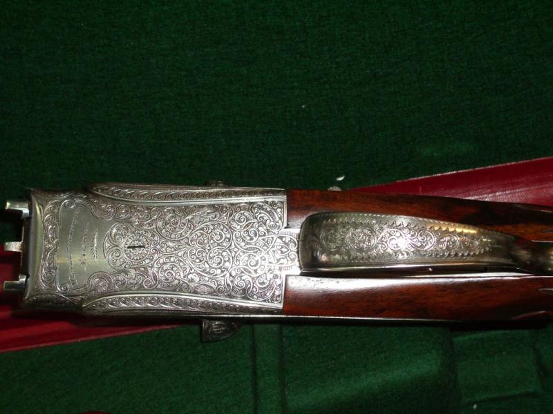 Lo que yo se de ella, segun me han contado, es que es una yuxtapuesta Víctor Sarasqueta, es anterior a 1930, concretamente de 1923, y hecha por Victor Sarasqueta Suinaga (armero real del rey Alfonso XIII). La escopeta perteneció a una pareja de ojeo que se hizo por encargo y está numerada con el numero 1 en oro en la palanca de apertura, entre los cañones, y en el pasamanos. Esta hecha en madera de raiz de nogal, dos gatillos, es expulsora, cañones de 68.5 cm, indice de nacar, iniciales grabadas en oro en la culata, indicadores de carga, pletinas largas tornasoladas y con grabados ornamentales hechos a mano de lujo, valvula de salida de gases, orejetas, llave de desmonte y cantonera tipo Holland.