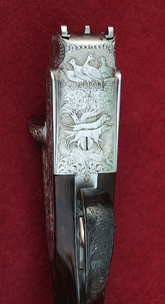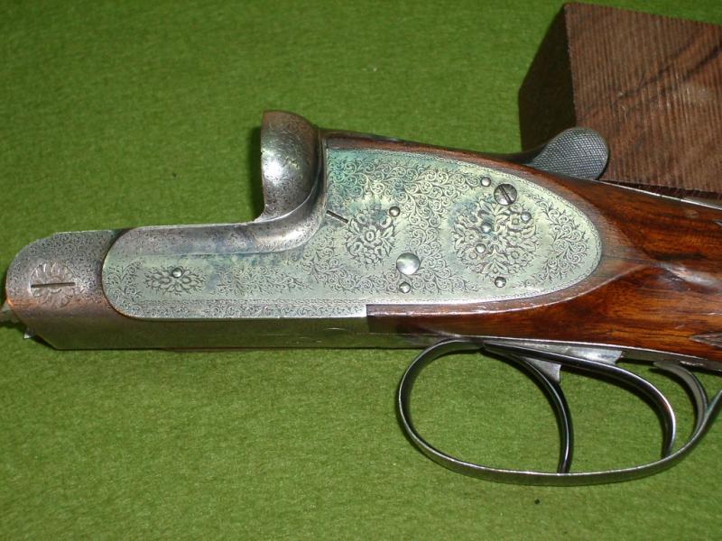 Lo que yo se de ella, segun me han contado, es que es una yuxtapuesta Víctor Sarasqueta, es anterior a 1930, concretamente de 1923, y hecha por Victor Sarasqueta Suinaga (armero real del rey Alfonso XIII). La escopeta perteneció a una pareja de ojeo que se hizo por encargo y está numerada con el numero 1 en oro en la palanca de apertura, entre los cañones, y en el pasamanos. Esta hecha en madera de raiz de nogal, dos gatillos, es expulsora, cañones de 68.5 cm, indice de nacar, iniciales grabadas en oro en la culata, indicadores de carga, pletinas largas tornasoladas y con grabados ornamentales hechos a mano de lujo, valvula de salida de gases, orejetas, llave de desmonte y cantonera tipo Holland.