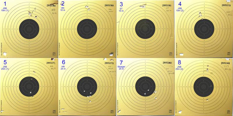 Los HN y los Stoeger agrupan razonablemente bien (para lo que yo quiero) tanto a 10 como a 25 metros. El problema con los JSB es que salen muchos balines que se separan mucho del grupo.