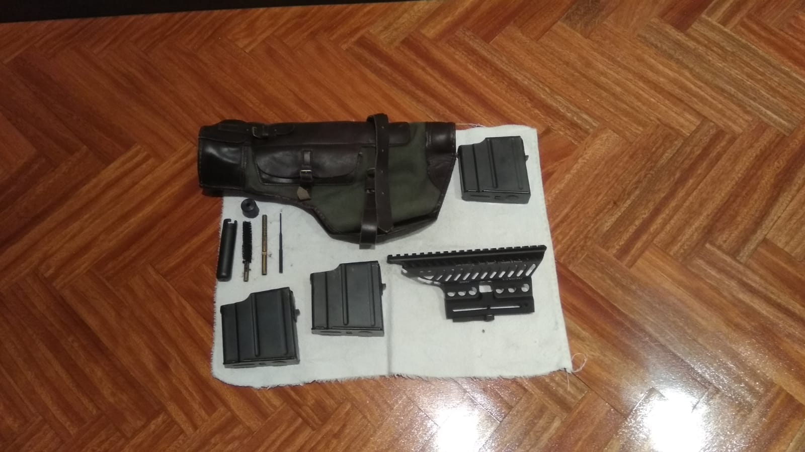 Incluye sus accesorios (3 cargadores, bandolera, herramientas, bayoneta ( no tiene mismo numero), funda de visor, manual de instrucciones en no se que idioma, otro rail para visor).