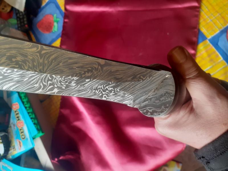 Mas fotos con detalles de la hoja. Por cierto, la guarda también está hecha en el mismo acero de damasco.