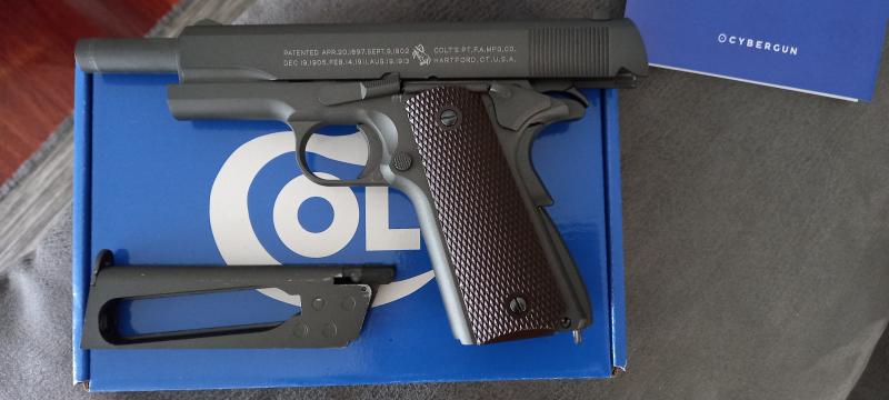 Pistola Colt 1911 de airsoft en calibre 6mm dispara bolas de plástico carga por botellas de co2, replica totalmente metálica con movimiento de partes. Ideal coleccionista. Estado como nueva solo estrenada con su factura y número de serie.