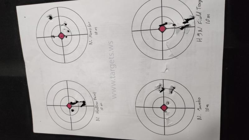 Los jsb entran mucho mejor que los h&n, y lo de la diana es tan sencillo como pegarla a un cartón, así no desgarra, yo siempre utilizo dianas de papel normal(fotocopia en casa) o directamente un folio a4 le dibujo un punto y a correr...
