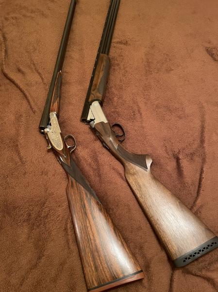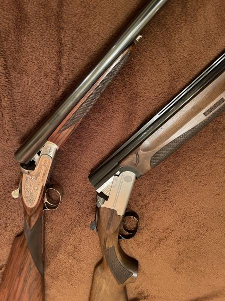 Ambas son de dos cañones, ambas del mismo cal. el 20, ambas son monodisparador, ambas son Expulsoras. ambas pesan exactamente lo mismo (2.825gramos..), ambas son recamaras 20-76, ambas son basculas en acero...pero son muy distintas, la una tiene los "ojos" como yo "paralelos", la otra uno encima del otro, la una dispara secuencialmente sin selector y nunca falla aun que falle el primer disparo (la Arrieta), la otra tiene selector pero necesita el retroceso del primer disparo para poder efectuar el segundo, la una tiene chokes fijos *-***, la otra tiene chokes intercambiables, la una es muy bella a pesar de ser muy mayor, la otra es joven y moderna, la una tienee los caños de 71, la otra de 68, pero se pueden usar chokes exteriores que la "alargan", la una esta muy suave y ajustada, la otra necesita aun muchos tiros para perder la "rigidez" y dureza. La una esta echa con kos mejores aceros y ajustes y sus buenas echuras se notan en la mano y en la vista, la otra sin ser "mala" no lse puede comparar . Dos armas muy utilizables y capaces que comparten detalles y que les separan muchos mas. En su dia la una costó 4 veces lo que la otra, sin embargo hoy en dia quizás su valor este equiparado lamentablemente.