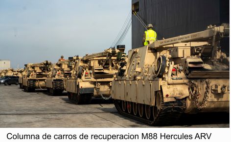 Para empezar comentaros que una división por ejemplo acorazada americana tiene tres brigadas (en España dos) y cada una de estas brigadas tiene una unidad tipo batallón logístico muy reforzado y aparte la brigada en conjunto tiene una unidad tipo regimiento logístico igualmente enormemente reforzado (imagen 6), con lo cual, una división cuenta con cientos de vehículos de todo tipo desde las más pequeñas paletizadoras hasta los enormes camiones góndolas porta carros pasando por todo tipo de camiones con todas las funciones inimaginables y sobre todo con decenas de carros de recuperación M88 Hercules ARV (imagen 2)