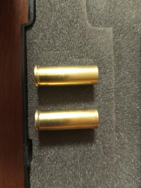 Estas dos vainas son Fiocchi de la misma caja. Una sigue con el tiro original en otro revólver distinto al mío. El tirador me regaló después las vainas. Unas tienen aquel tiro original y otras ese +1 recarga mía y ese disparo en mi revólver. Diferencia: la original tiene en el exterior 0.0015" (una milésima y media) más que la que sale de mi revólver. Situación: en la original, sin recalibrar, la misma WC campanea y en la otra no.