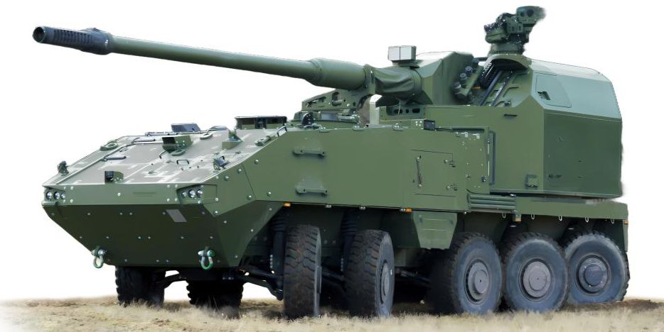 Mowad Piranha 10x10 Heavy Mission Carrier «HMC» AGM con cañón de 155 mm., con torre giratoria montada en la plataforma multifunción.
