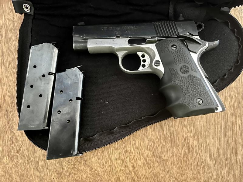 Comprado a un compañero del foro como capricho, esta en perfecto estado mecánico, el exterior tiene marcas de uso (como es normal en un arma de este tipo), funciona perfectamente, modelo V10 Ultra Compacto de doble tono, muy apreciado en USA, modelo poco común en España, tiene un retroceso agradable, dispone de salida de gases en el cañón para anular la sobre elevación, para disparar 230Gr con total suavidad, sorprendente poder de fuego, para un arma tan pequeña.