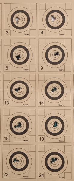 En mi caso, tengo tres balines que están totalmente fuera del grupo. No sé si por problema del propio balin, o falta de precisión del cañón. Puede ser una mezcla de ambos.