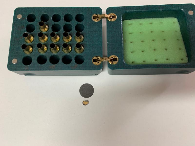 Subo otra foto, son once tiros a 50 metros, usando solamente dos bolsas de arena, son once balas que me sobraros de una competición y fui al campo de tiro a "descargarlas", es el agujero de debajo del parche, viendo el diámetro que tienen los cuellos de las vainas, ya te haces una idea de la agrupación.