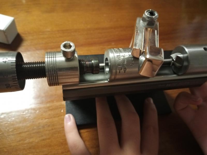 Estaba puesto para la medida de un cartucho más largo, sea mi 35 Whelen o mi 270 Win, no recuerdo. Pero se ajusta al que uno use con la simple rosca y tornillo de fijación.