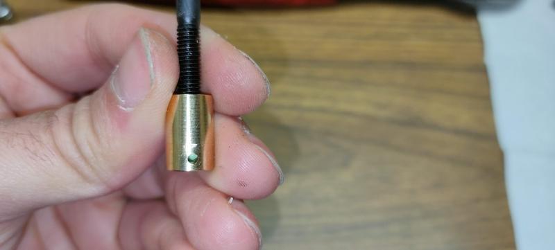 Colocamos el pistón en el soporte, de forma que la parte cóncava del pistón se alinee con el agujerito del soporte, como se aprecia en la foto. Después roscaremos el soporte del pistón al tornillo herramienta para poder meterlo en el casquillo, de forma que se alineen los agujeritos del soporte del pistón y del casquillo.