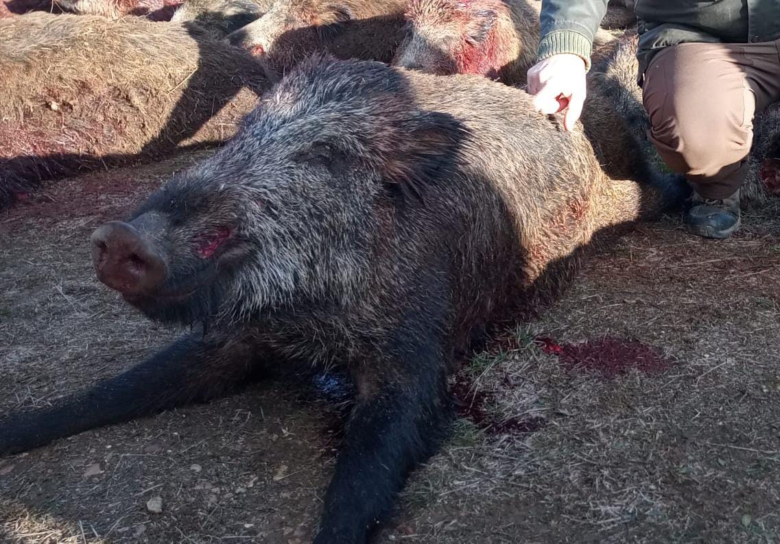 En el segundo guarro se aprecia la salida, un pequeño agujero en mitad del lomo. Por el lado de la entrada el disparo estaba bastante más alto, más cerca del espinazo.. ni acuso el disparo.