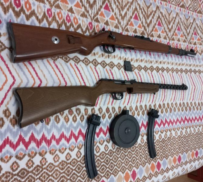 Vendo dos carabinas del cal. 22LR, una Pietta PPS-50 (réplica del subfusil soviético PPSH-41), y una Norinco JW25 (réplica del alemán Mauser Kar 98K), en buen estado, con señales normales de uso.