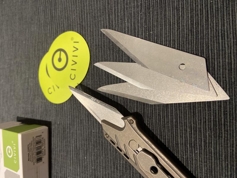 Cutter tipo kiridashi. 4 hojas reemplazables y afilables de 1,2 mm en acero 9Cr18MoV con una dureza de 60 HRC, una de ellas en damasco. La estructura, como nueva, es en titanio de tan solo 70 grs de peso. Una de las hojas ( la que està montada) está usada y reafilada pero en perfecto estado. Las otras 3 sin usar. Envio incluido a península.