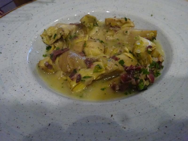 Cocochas de bacalao fresco Skrei en salsa verde que estaban muy ricas, carrilleras, alcachofas naturales con jamon, tarta de queso, tiramisú, cuajada con miel y peras Melba.