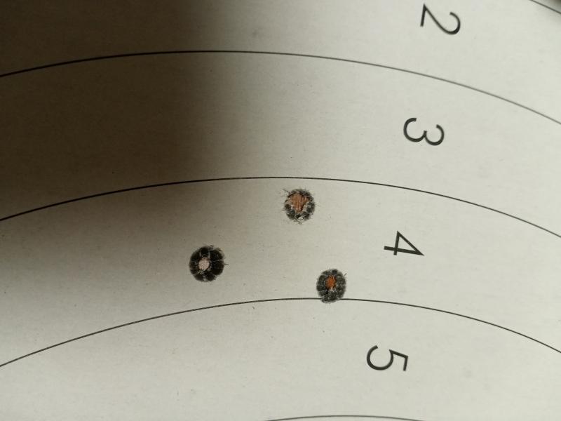 Dos tiros él y uno yo a escasos 80 mts apoyados en una piedra plana usando mochila. Blanco casero, un folio DinA 4 con una cruz pintada para poner la Cruz del visor en ella.Los tres cosidos uno al otro sin hacer cacahuetes, unos 4 CMS altos sin ninguna deriva, así que está perfecto, falló el indio.