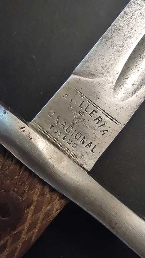 El rifle funciona perfecto ya que mi padre lo usaba de vez en cuando y nunca vi que le diese problemas y la bayoneta, efectivamente está fabricada en Toledo. Dejo una foto con el detalle del marcaje.