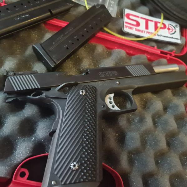 Puedo estar equivocado y agradecería la corrección, pero el arma no es una STI sino una STP, que no es lo mismo. En las imágenes puede verse claramente el logo de STP, aunque en una de ellas aparezca "STI Europe".