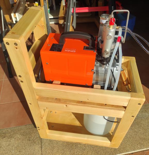 He preparado un mueble para colocar el compresor Onix Eolo 1000 y su depósito de agua para refrigerar el mismo.
